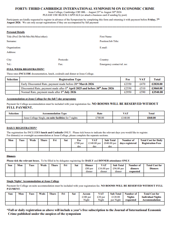 The 43rd Cambridge International Symposium on Economic Crime will run from 23 to 30 August 2026, at Jesus College, Cambridge.